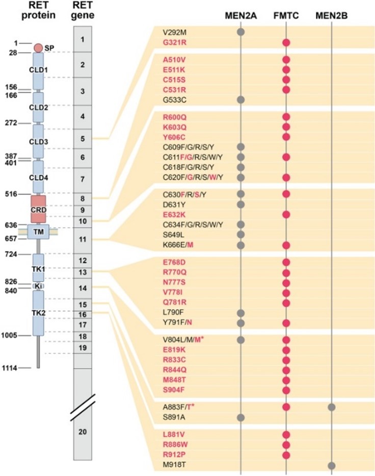 - Frank-Raue K, Rondot S, Raue F. Molecular genetics and phenomics of RET mutations: Impact on prognosis of MTC. Mol Cell Endocrinol. Jun 30 2010;322(1-2):2-7. doi:10.1016/j.mce.2010.01.012