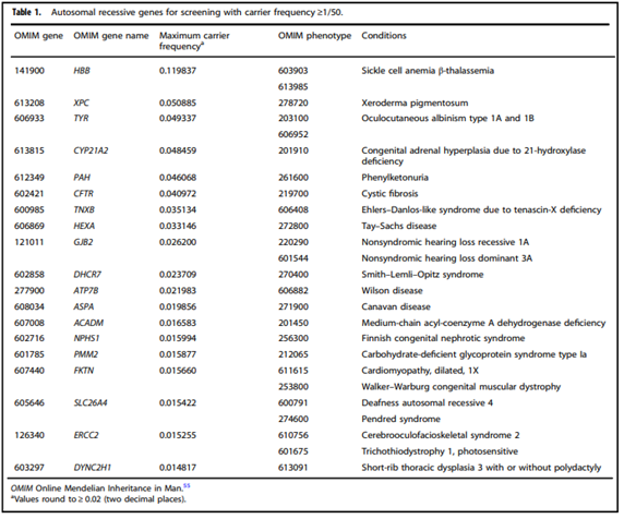 22. Gregg AR, Aarabi M, Klugman S, et al. Screening for autosomal recessive and X-linked conditions during pregnancy and preconception: a practice resource of the American College of Medical Genetics and Genomics (ACMG). Genetics in medicine : official journal of the American College of Medical Genetics. Oct 2021;23(10):1793-1806. doi:10.1038/s41436-021-01203-z