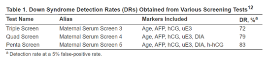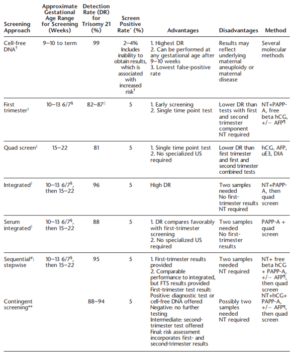 2. Second-trimester (15-22 weeks) screening incorporating triple maternal serum markers (hCG, AFP, uE3 with NT) and quad maternal serum markers (hCG, AFP, uE3, DIA with NT).