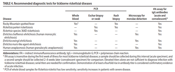 14. For individuals suspected of having a rickettsial disease (see Note 11), the use of standard blood culture, NAAT, or IFA assay for IgM antibodies is considered NOT MEDICALLY NECESSARY.